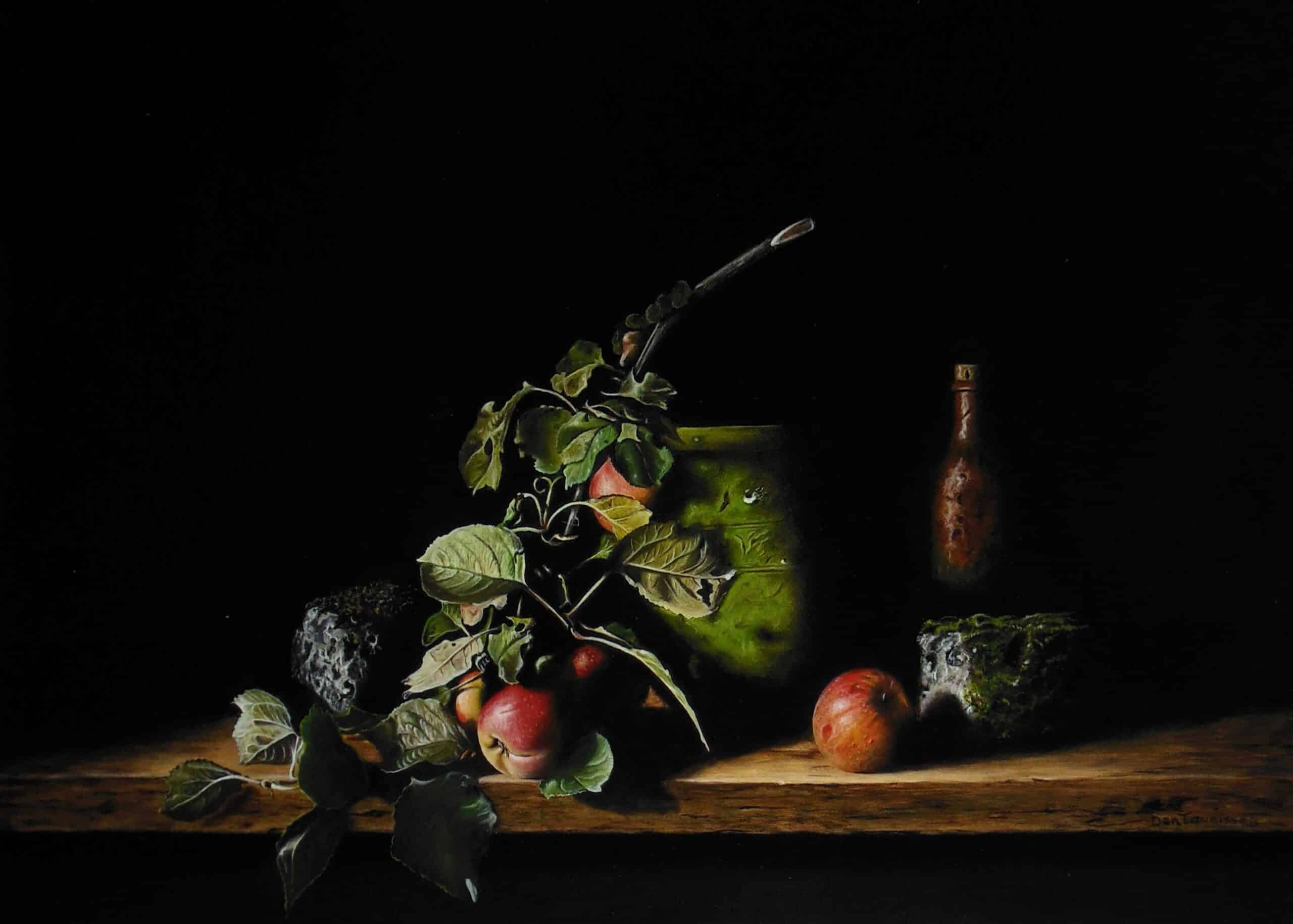 Stilleven met appels en kruik met groene algen